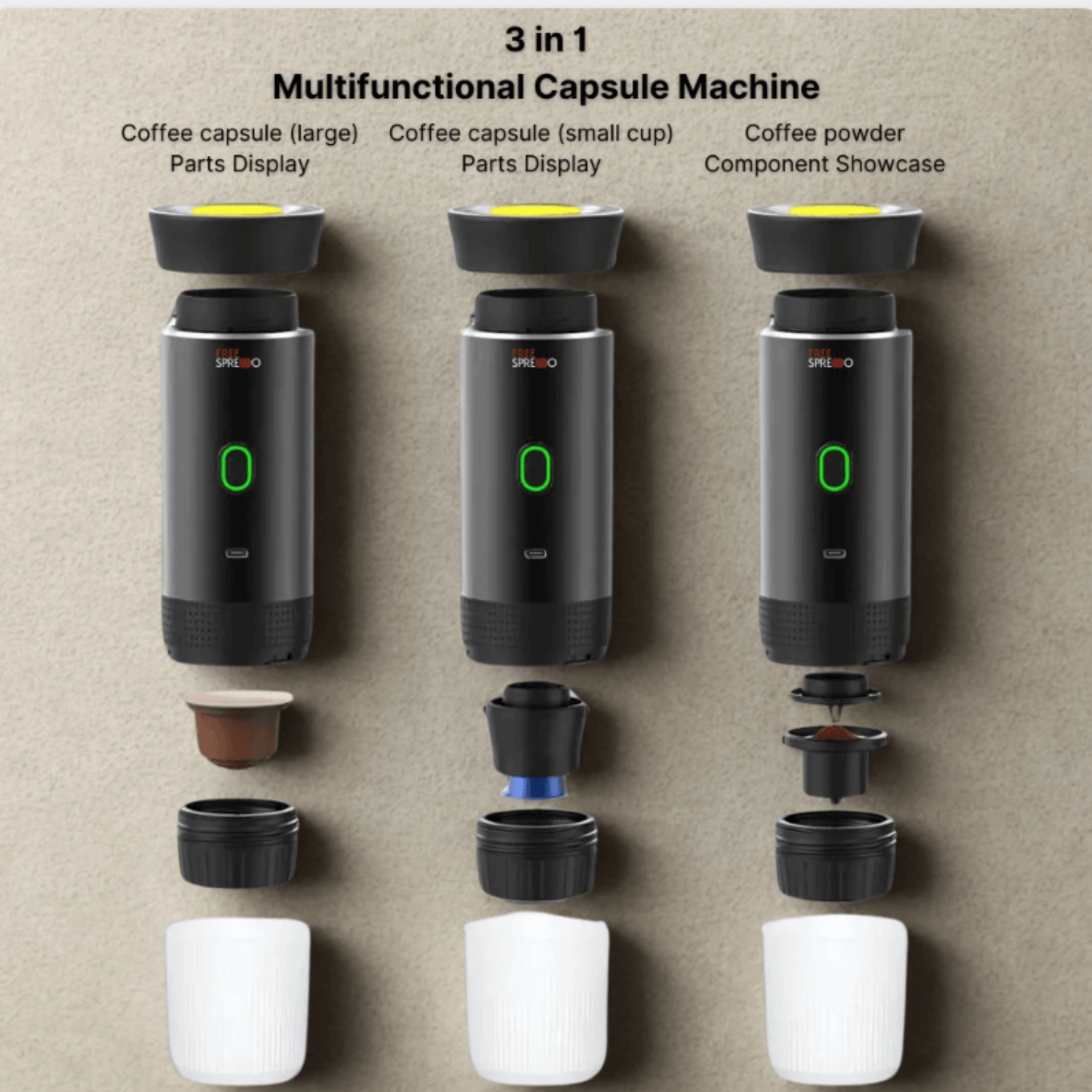 This 3-in-1 The True Brew™ Portable Coffee Maker is compatible with any ground coffee or Nespresso/Dulce Gusto coffee pods.